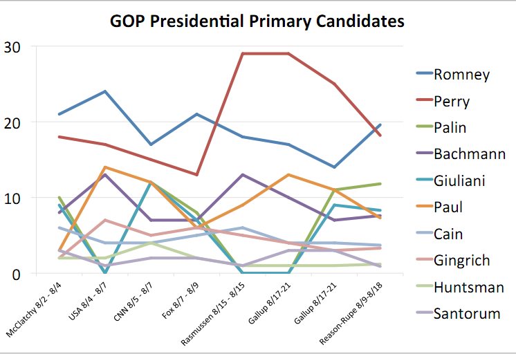 The above chart shows that Perry’s numbers soar when Palin and Giuliani are not included in the list of candidates (they were not listed in either the Rasmussen or Gallup polls). This suggests Perry may regain a lead over Romney if it becomes clear that Palin and Giuliani will not join the race.